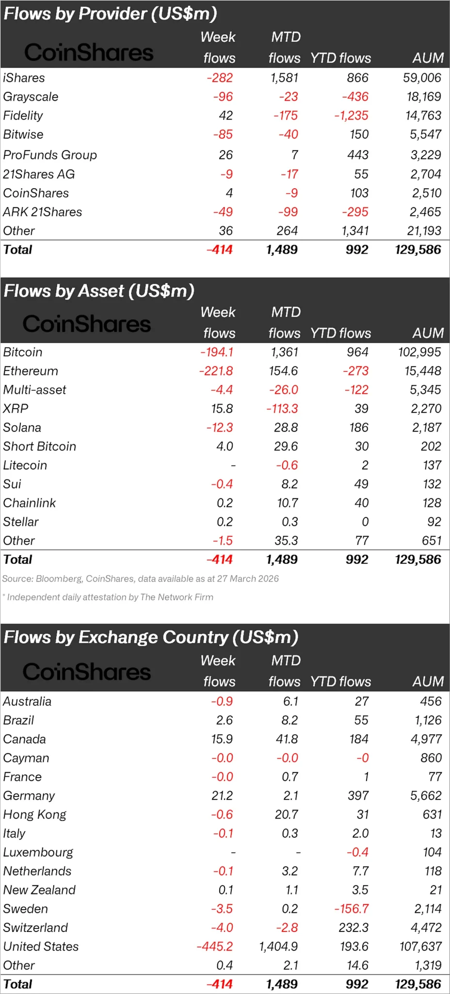 コインシェアーズは仮想通貨に関するレポートを発表し、先週4億1400万ドルの資金流出があったと述べた。